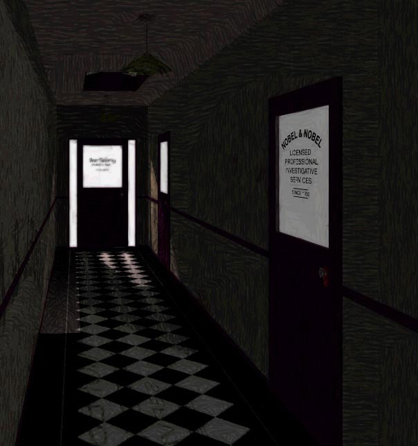 Here's the final lighting. Note that the overhead bulb near the far door is gone. Instead, all light is coming through the glass of the three doors. Also, the doors now have logos of different businesses. It was fun creating them. The logo of the detective agency is a tribute to two of my favorite fictional detectives, Nick and Ida Nobel. They appear in ZBS Media's offbeat film noir musical The Maltese Goddess.