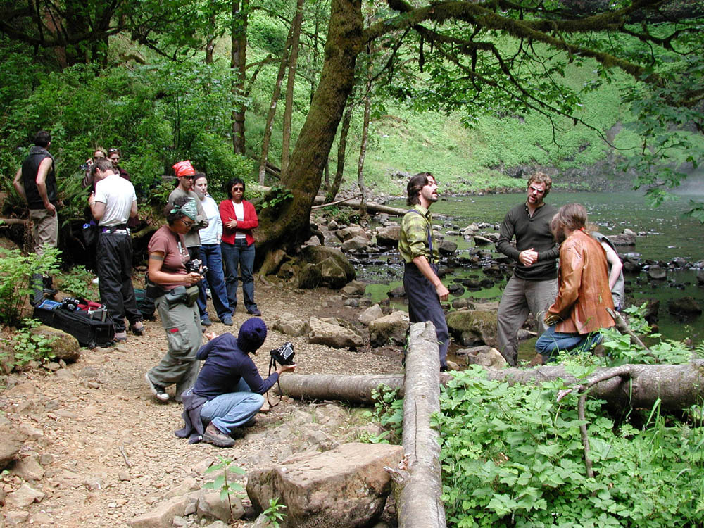 We trouped down to the base of the first falls with the photographer, three more professional models, and assorted crew. There, four of us were instructed on the scenario we were supposed to be portraying: tired but wired, as if someone had been chasing us through the woods and was still after us. We had taking a breather, trying to decide what to do, aware that our pursuer could be behind the next rock. Agitation, alertness, etc. Think high fashion meets Deliverance. It was ridiculous, but then, that's the name of the game, isn't it?