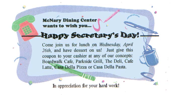While cleaning my apartment the other night, I uncovered a coupon that was distributed to secretaries at the local university just before Secretary’s Day. Even discounting the fact that this so-called holiday originated in the mind of marketers, the coupon was horrifying. Here it is in its entirety: